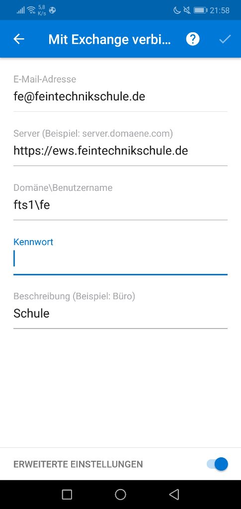 Als Servername ist nur https://ews.feintechnikschule.de und SSL-Verschlüsselung zu wählen. Die Domäne FTS1 und der Loginname sind meist durch Backslash getrennt einzugeben. Beispiel in „Outlook for Android“: