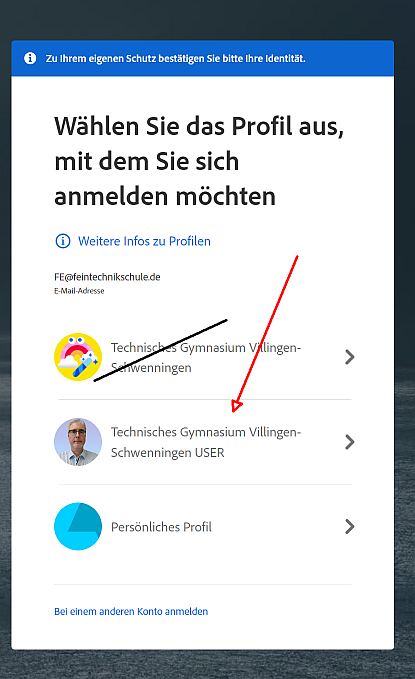 Melden Sie sich ab und neu an mit dem Account „Technisches Gymnasium Villingen-Schwenningen USER“.
